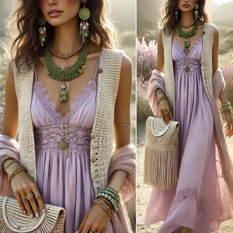 Este estilo se inspira en la naturaleza y en la feminidad, combinando tejidos vaporosos, bordados delicados y accesorios artesanales con un aire relajado pero sofisticado.